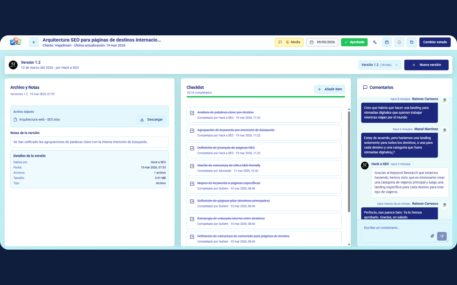 Estrategia, RRHH, SEO... Presentan entregables versionados con un historial de cambios claro y ordenado.